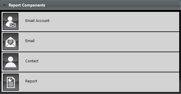 Come sempre è chiesto di trascinare i componenti richiesti dalla area “Componenti”. La particolarità di questo componente è dato dall’uso di differenti componenti all’interno un singolo guppo per completare il lavoro. Come puoi vedere dall’immagine a fianco puoi vedere i componenti richiesti (Email account, Email, Conatto, Report).