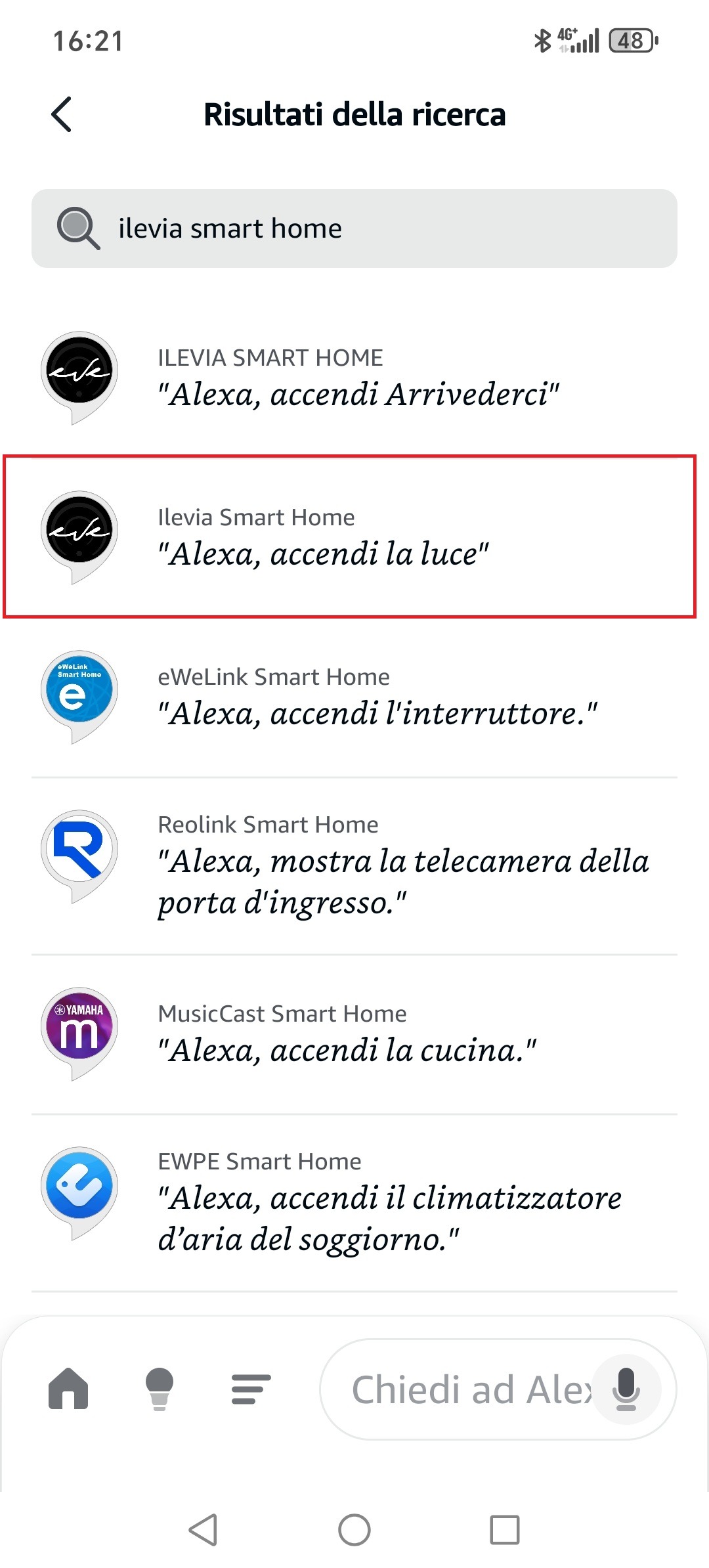 Come fare la ricerca della skill Ilevia smart home all'interno dell'applicazione di Amazon Alexa